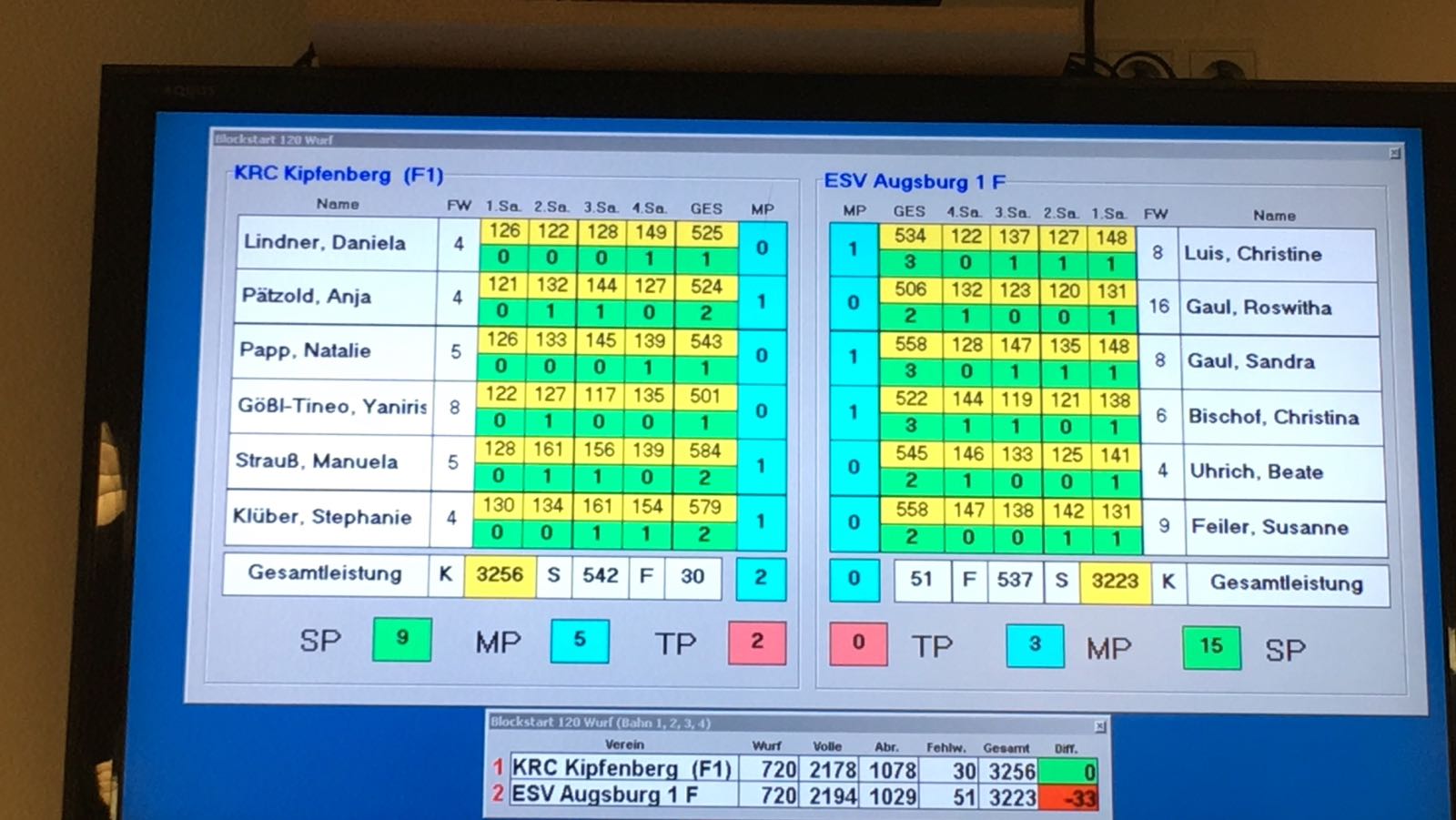 Die Kipfenberger Damen dagegen mussten sich im nächsten Abstiegskampf gegen den ESV Augsburg zur Wehr setzen und wurden durch eine starke Mannschaftsleistung mit einem Sieg von 5:3 und 3259:3223 belohnt.