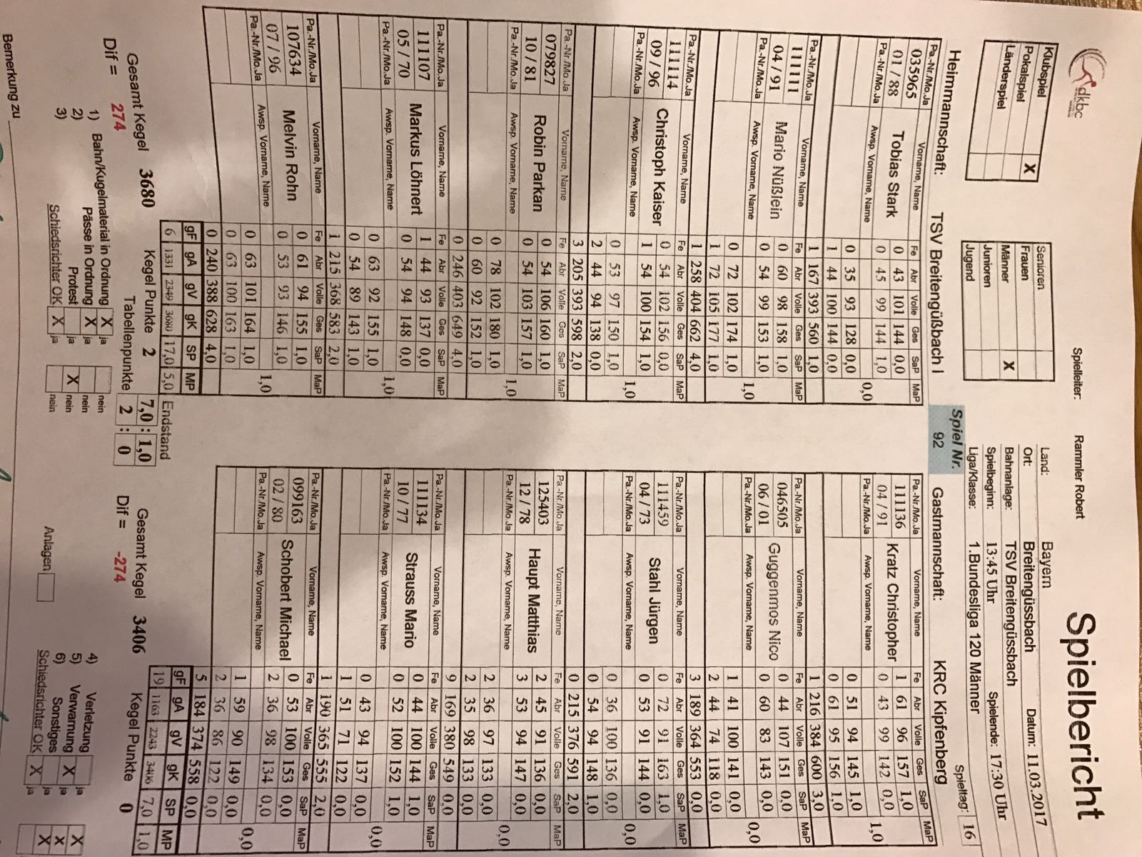TSV Breitengüßbach – KRC Kipfenberg 7:1 (17:7/3680:3406 Holz)