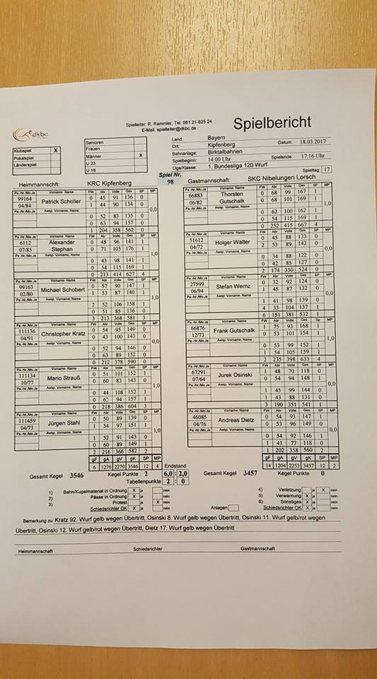 Auf den Birktalbahnen waren die Hessen aus Lorsch zu Gast und hatten in der Anfangsphase mit Thorsten Gutschalk ihren stärksten Kegler auf die Bahn geschickt. Patrick Scholler war der Leidtragende, denn mit einem deutlichen 0:4 und mageren 562 Holz war er gegen den Tagesbesten Thorsten Gutschalk (667 Holz) auf verlorenem Posten. Im anderen Duell dagegen hatte Alexander Stephan gegen Holger Walter (524 Holz) leichtes Spiel und setzte sich mit 4:0 und 627 Holz ebenfalls deutlich durch. So war einiges geschehen, aber mit 1:1 und 2 Holz Rückstand nicht viel passiert. In der Mittelpaarung konnten die Zuschauer einen ähnlichen Verlauf erleben. Michael Schobert konnte sich immer besser von Stefan Wernz (532 Holz) absetzen und gewann mit 3:1 nach Sätzen und mit 581 Holz den zweiten Mannschaftspunkt. Christopher Kratz hatte mit Frank Gutschalk schon ein größeres Kaliber vor der Brust und konnte den Schaden noch in Grenzen halten. Mit 0:4 konnte er zwar keinen Durchgang gewinnen, aber mit 590 Holz zog er sich ordentlich aus der Affäre. Es entwickelte sich eine spannende Partie und nach dem zweiten Drittel stand es 2:2 bei einem leichten 4 Holz Vorteil für Kipfenberg. In der Schlusspaarung kam Mario Strauß mit 152:118 Holz glänzend ins Spiel, während Jürgen Stahl mit 139:147 Holz den ersten Satz abgeben musste. Der zweite Durchgang war in beiden Duellen eine enge Kiste. Mario Strauß gab den zweiten Satz ab und führte bei einem 1:1 mit 295:266 Holz und Jürgen Stahl glich zum 1:1 aus und lag mit 290:296 auf Tuchfühlung. Im dritten Durchgang sorgte Mario Strauß mit 152:144 in seinem Duell mit 2:1 und einem Zwischenstand von 447:420 Holz für die Vorentscheidung. Jürgen Stahl gab seinen Durchgang mit 143:146 Holz ab und lag mit 1:2 und 433:442 Holz zurück. Kipfenberg ging mit einem Vorteil von 32 Holz auf die letzte Bahn, zeigte in diesem Durchgang Siegeswillen und wurde dafür auch belohnt. Mario Strauß setzte sich mit 3:1 und starken 604 Holz gegen Jurek Osinski (541 Holz) am Ende deutlich durch. Jürgen Stahl steckte nie auf, konnte zum 2:2 ausgleichen und mit 582 Holz gegen Andreas Dietz (560 Holz) auch noch gewinnen. Die Hessen hatten mit Thorsten und Frank Gutschalk zwei starke Kegler in ihren Reihen, aber das war an diesem Tag gegen ein ausgeglichenes Kipfenberger Team zu wenig. Am letzten Spieltag geht die Reise für Kipfenberg nach Sachsen- Anhalt zum Serienmeister. Der SKC Rot-Weiß 1999 Zerbst hat seinen Titel erfolgreich verteidigt, fing sich aber die erste Saisonniederlage ein und ist nicht unverwundbar. Kipfenberg kann auf eine erfolgreiche Bundesligasaison zurückblicken und gegen Zerbst locker aufkegeln.