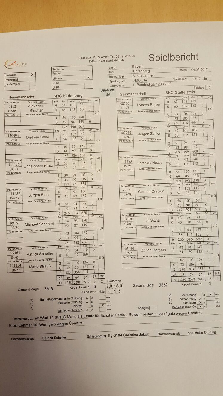 Der Kampf um den begehrten Platz Vier in der Tabelle (Startplatz für den internationalen Wettbewerb) war sofort on fire, wobei die Gäste eine bessere Figur machten. Alexander Stephan kam mit 155 und 150 Holz gut ins Spiel, doch gegen Thorsten Reiser (165,162 Holz) lag er mit 305:327 Holz und 0:2 Satzpunkten zurück. Auch sein Partner Dietmar Brosi lag mit 147 und 157 Holz gegen Jürgen Zeitler (163,158 Holz) mit 304:321 ebenfalls mit 0:2 zurück. Auch im weiteren Verlauf agierten die Kipfenberger zu ungenau. Vor allem das Gassenspiel war bei den Gästen effektiver, was sich am Ende auch deutlich bemerkbar machte. Alexander Stephan war mit seiner Leistung von 604 Holz und 1:3 gegen den Tagesbesten Thorsten Reiser (644 Holz) sichtlich unzufrieden. Im anderen Duell passte bei Dietmar Brosi nicht mehr viel zusammen und so brachte seine magere Ausbeute von 568 Holz gegen Jürgen Zeitler (608 Holz) keinen Punkt ein. Nach dieser eher schwachen Anfangsphase war Kipfenberg mit einem Rückstand von 0:2 Mannschaftspunkten und 80 Holz auf dem Boden der Tatsachen zurück geholt worden. Mit diesem Zwischenstand konnte sich Kipfenberg nicht anfreunden und das Mittelpaar begann mit einem guten ersten Durchgang. Christopher Kratz holte sich mit 148:140 Holz den ersten, aber auch enttäuschender Weise den letzten Satz. Jürgen Stahl auf der anderen Seite machte mit 156:147 Holz ebenso Boden gut und der Rückstand wurde auf 63 Holz verkürzt. Am letzten Spieltag noch als Matchwinner gefeiert, zeigte Christopher Kratz die Rückseite der Medaille, die keinen Glanz ausstrahlte. Mit 554 Holz entfernte er sich weit vom Bundesliganiveau und so zog Jaroslav Hazva mühelos mit 598 Holz vorbei und gewann mit 3:1 den MP für Staffelstein. Jürgen Stahl avancierte zum Einzelkämpfer und mit einem 2:2 und starken 620 Holz konnte er Cosmin Craciun (607 Holz) in die Knie zwingen. Der erste Mannschaftspunkt war eingefahren, aber der Rückstand vergrößerte sich auf 131 Holz und die Hoffnungen auf einen Erfolg schwanden immer mehr. In der Schlusspartie hatte der Auftritt von Patrick Scholler noch nicht richtig begonnen, schon war er nach 30 Schub und nur 110 Holz wieder zu Ende. Mario Strauß kam zum Einsatz und begann mit 160 Holz sehr stark. Mit 270 Holz stand gegen Zoltan Hergeth (286 Holz) ein 1:1. Michael Schobert führte im anderen Vergleich gegen Jiri Vicha (287 Holz) mit 299 Holz und 2:0. Sollte Kipfenberg den Kampf vielleicht noch drehen können? Nein, denn Mario Strauß ließ 136 und 135 Holz folgen und so stand ein weiteres schwaches Ergebnis von 541 Holz an der Anzeigetafel. Zoltan Hergeth sicherte mit 633 Holz den nächsten MP für sein Team. Für eine Resultatsverbesserung konnte nur noch Michael Schobert sorgen, der mit starken 632 Holz gegen Jiri Vicha die verdiente Niederlage nicht mehr verhindern konnte. In der Summe hatte Kipfenberg zu viele Schwachstellen, was die Gäste eiskalt ausnutzten und so den vierten Tabellenplatz absichern konnten. Kipfenberg steht trotz der Niederlage weiter auf Platz fünf, aber mit dieser Leistung werden keine weiteren Punkte aus den letzten drei Partien mehr dazu kommen.