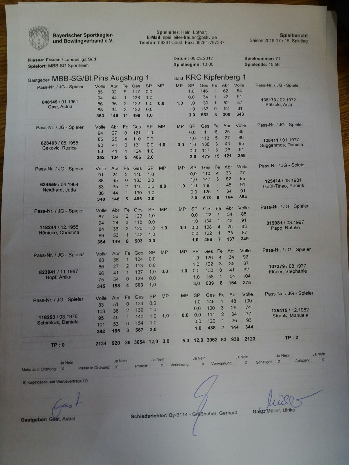 MBB-SG/BL.Pins Augsburg – KRC Kipfenberg 3:5 (12:12/3054:3062 Holz)