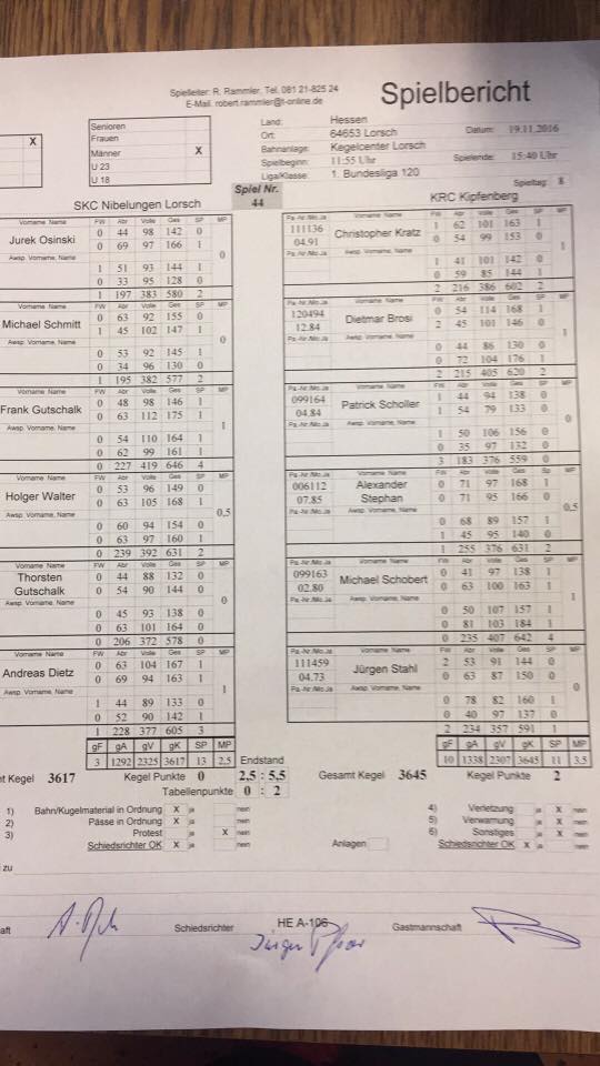 Nach dem wichtigen Heimsieg von letzter Woche konnten die Bundesliga Kegler vom KRC Kipfenberg die Reise nach Hessen zum SKC Nibelungen Lorsch ohne großen Erfolgsdruck antreten. Kipfenberg gab die Favoritenrolle gerne an den Tabellendritten ab und setzte immer wieder kleine Nadelstiche mit großer Wirkung. Nach einer spannenden Begegnung und einem fulminanten Schlussspurt konnte Kipfenberg erstmals bei den Hessen als Sieger die Bahnen verlassen.