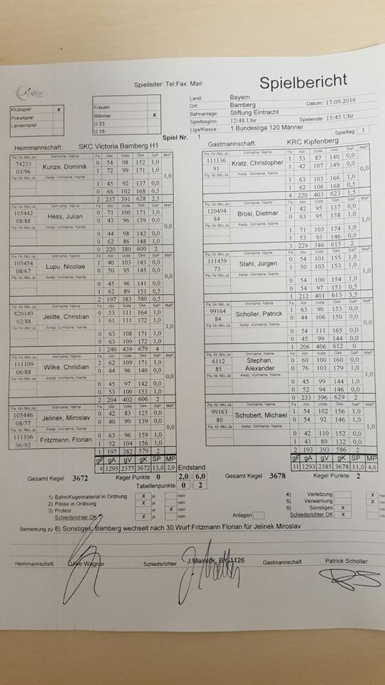 SKC Viktoria Bamberg – KRC Kipfenberg 2:6 ( 13:11/ 3672:3678 Holz)